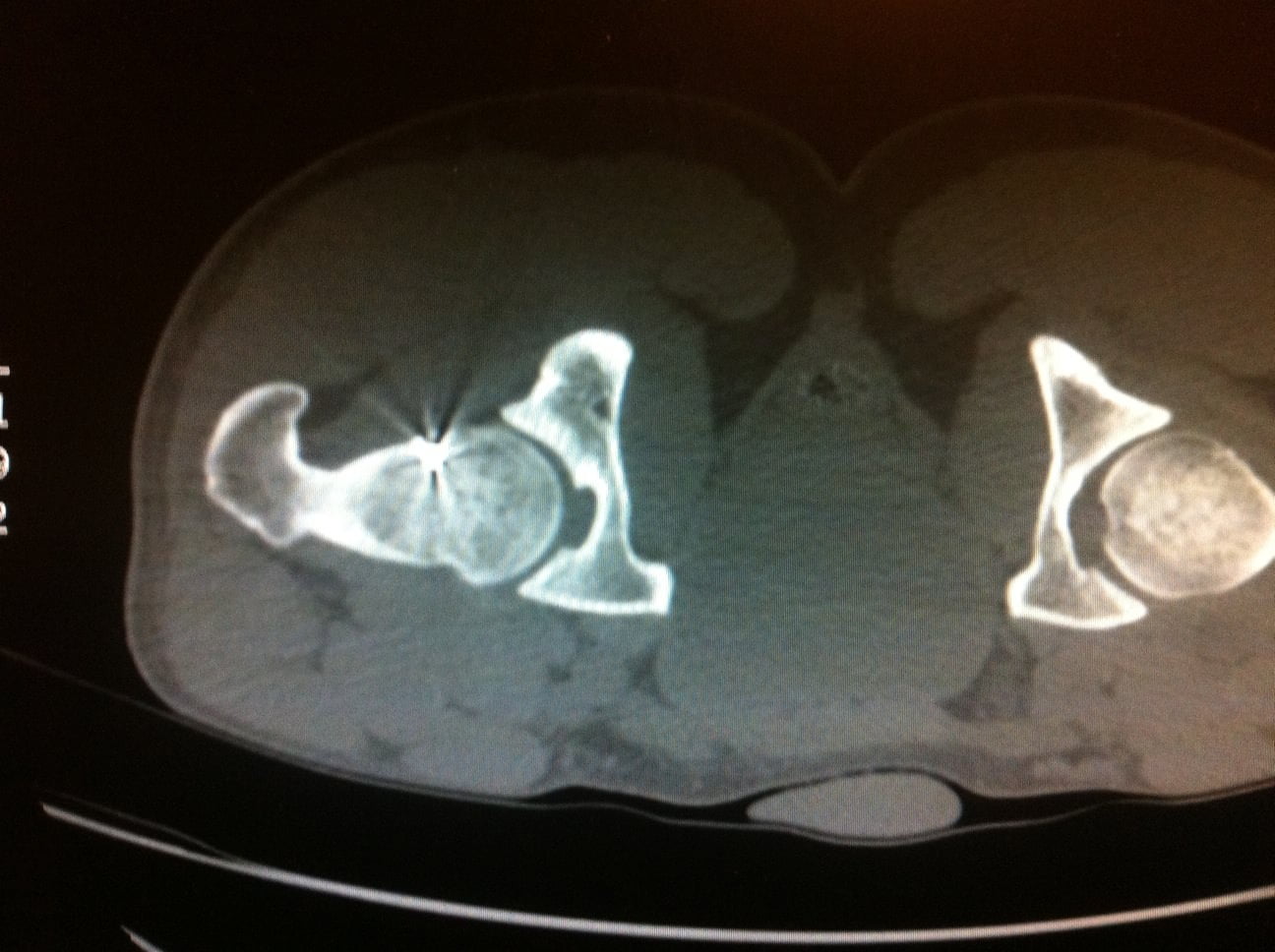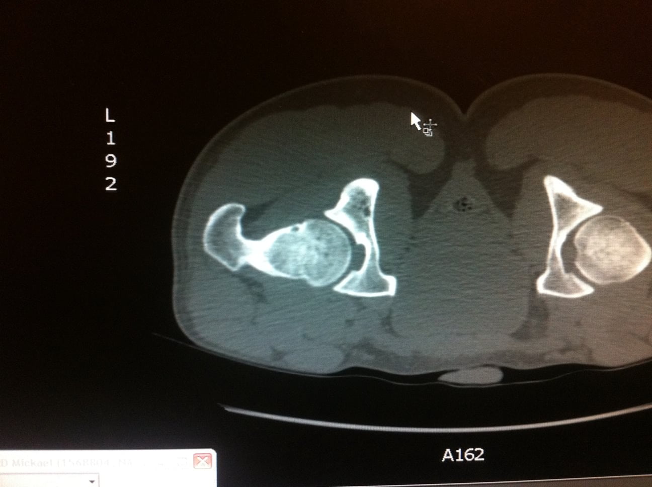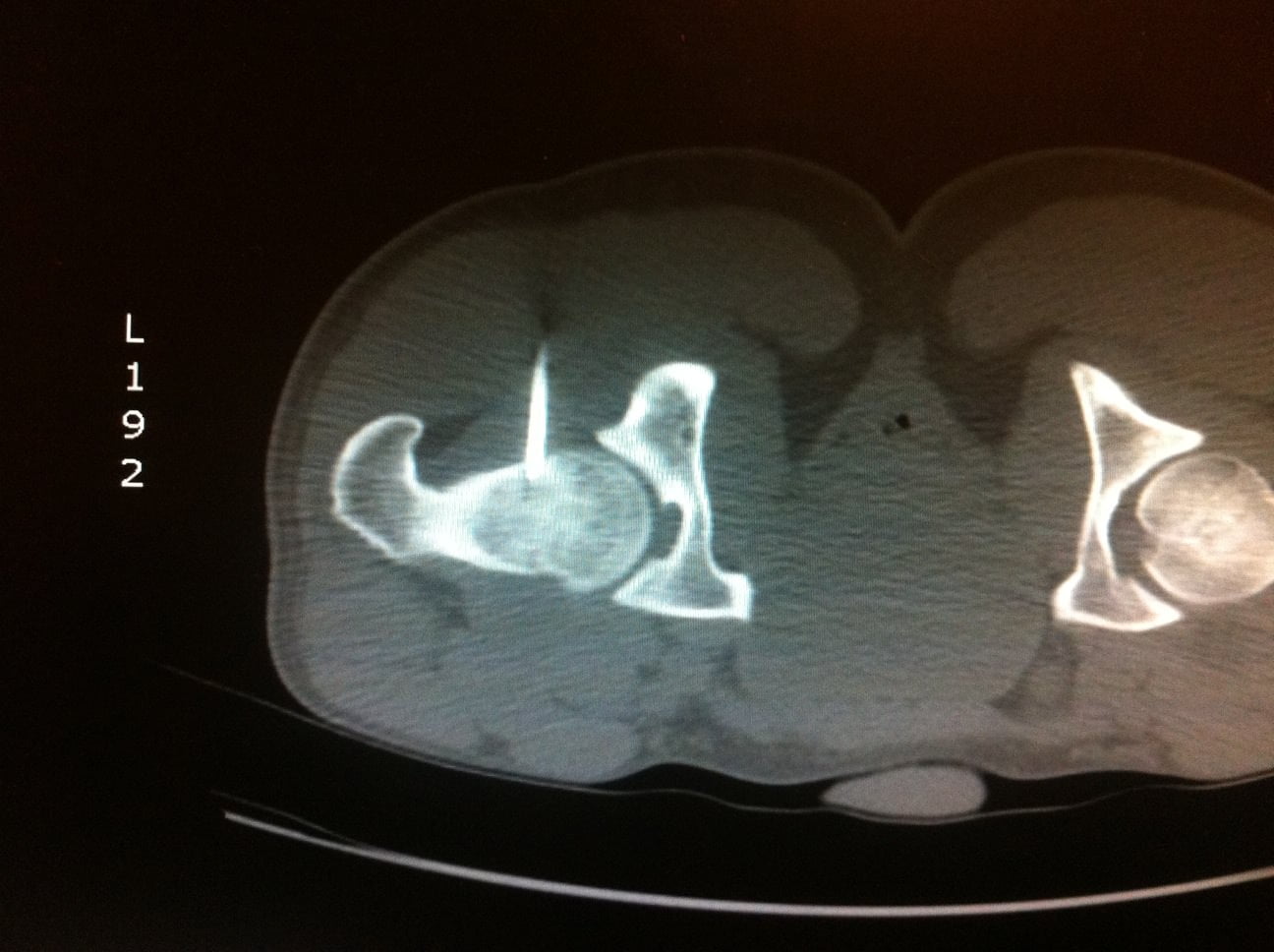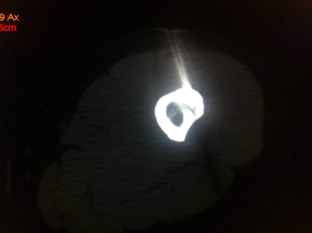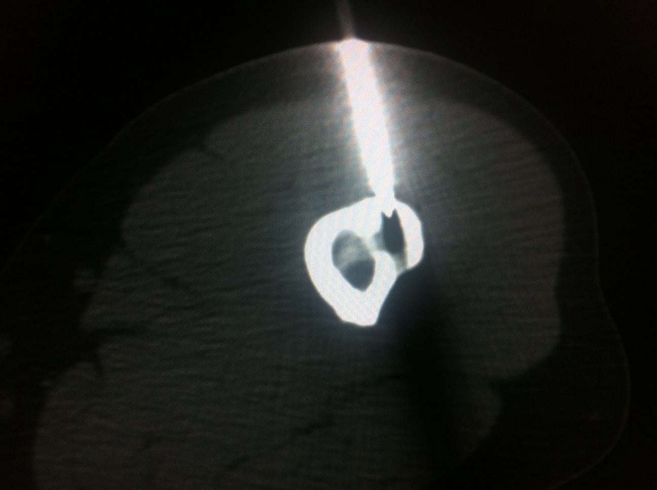 Sous guidage scopique et scanner un trocart 11 gauges coaxial Thiebaud t’AM est introduit dans la tumeur. Le contrôle itératif par scanner permet de positionner au plus près le matériel. Cette technique évite une ouverture cutanée mais surtout permet de conserver la structure osseuse adjacente et s’assure d’une précision optimale.