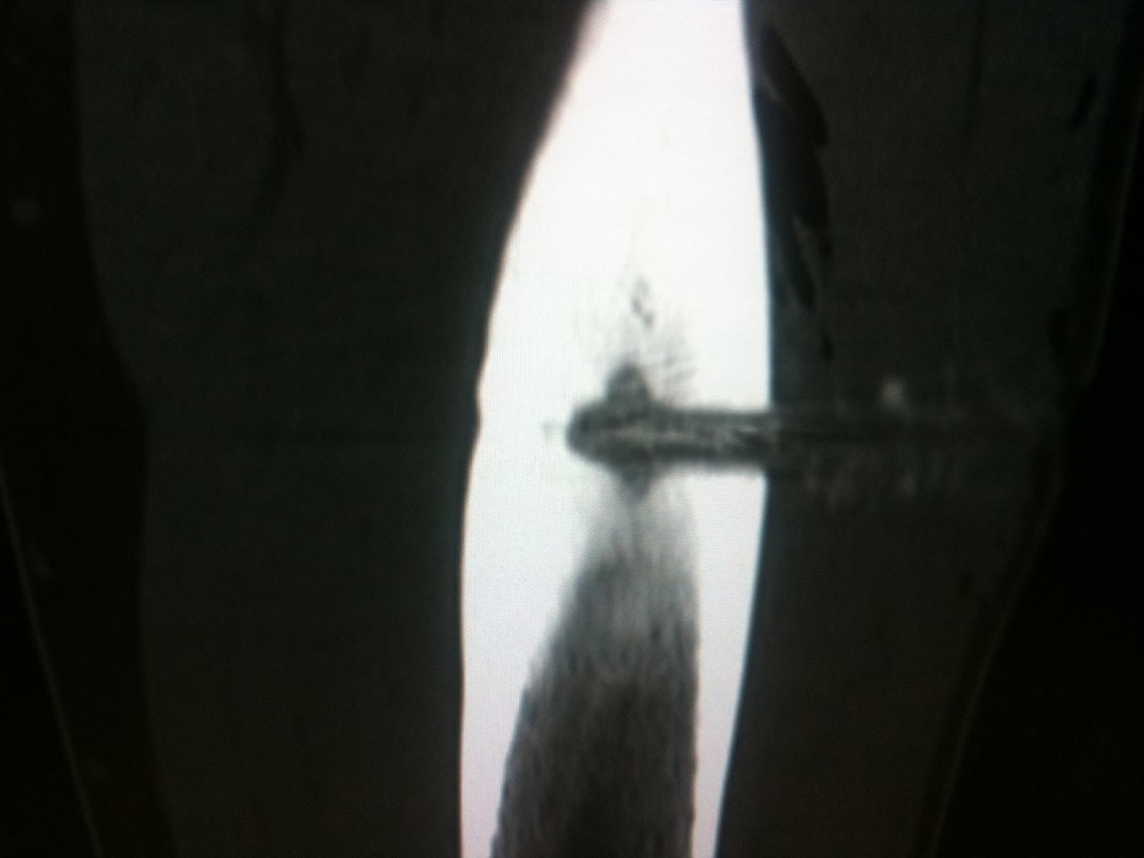Nous réalisons la Mise en place d’une sonde de RF de 1mm au centre du nidus puis Ablation par RF à 90° pendant 4 à 5 mn