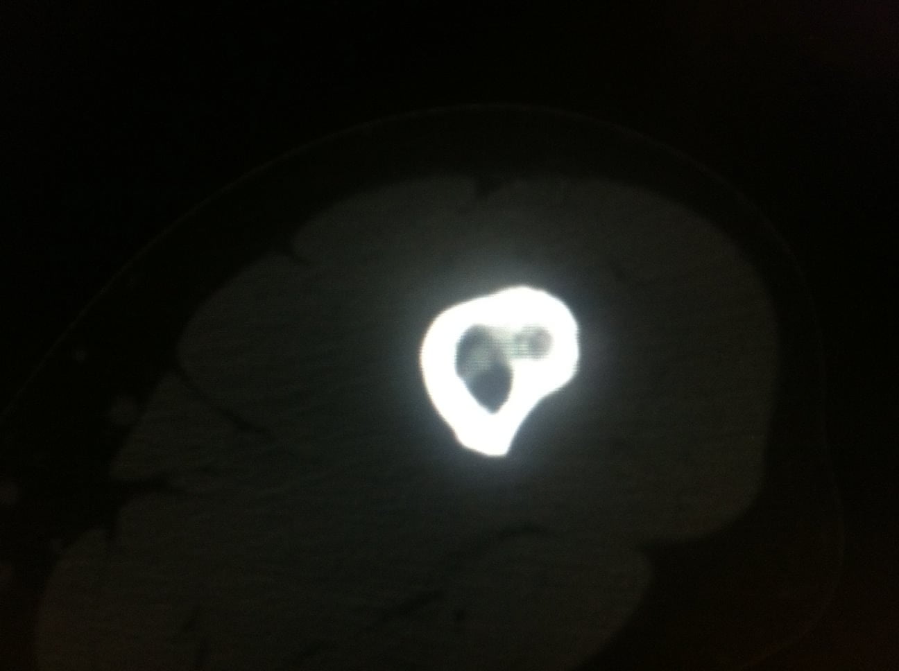 Le Nidus = hypodensité à contours nets associé à une hyperdensité calcique linéaire centro-tumorale correspondant à la vascularisation centrale. Une zone hypodense osseuse linéaire au niveau perilésionnel en regard de la condensation est assez spécifique. L’Ostéocondensation périphérique est homogène et peut provoquer une réaction périoste.