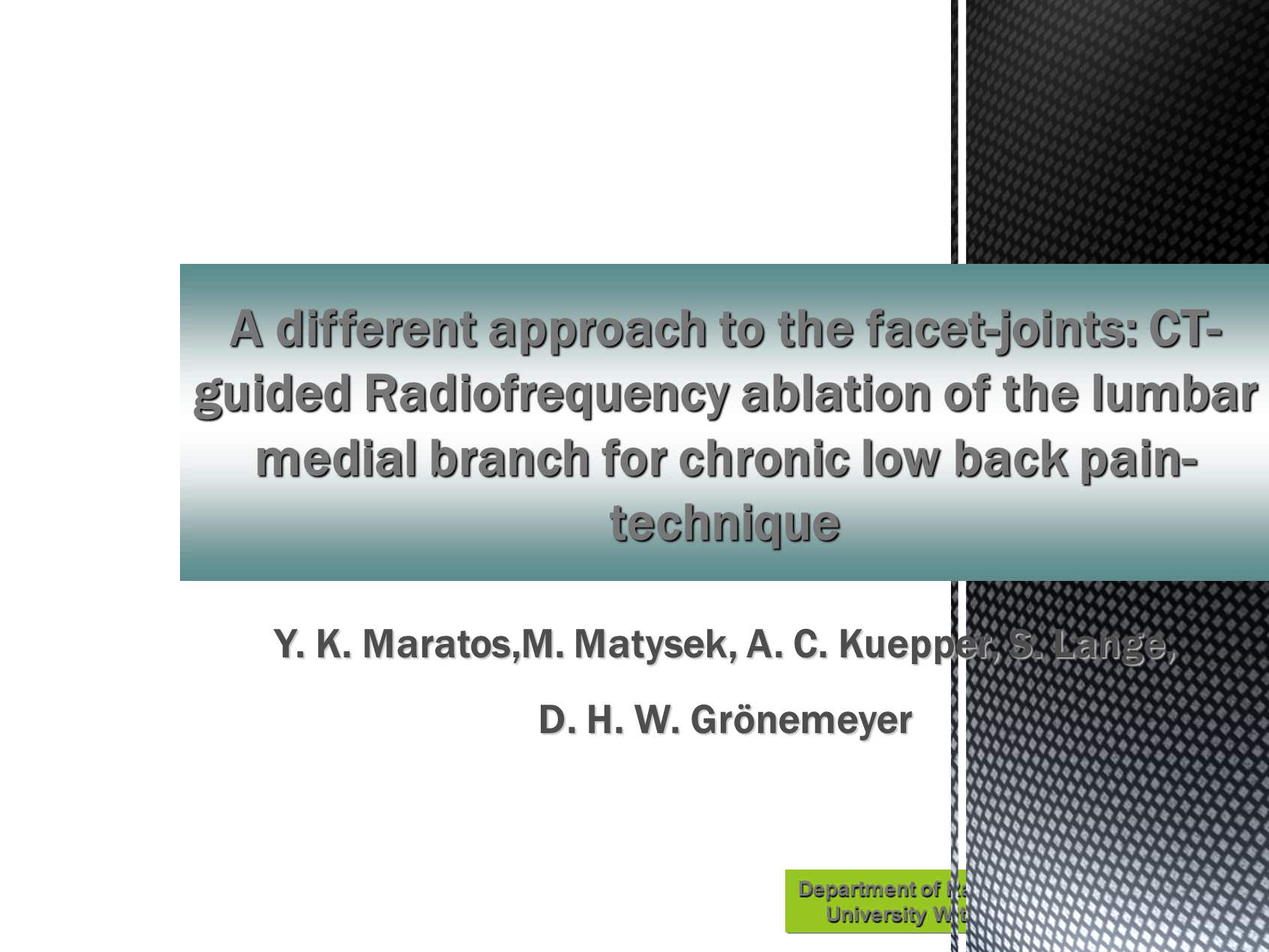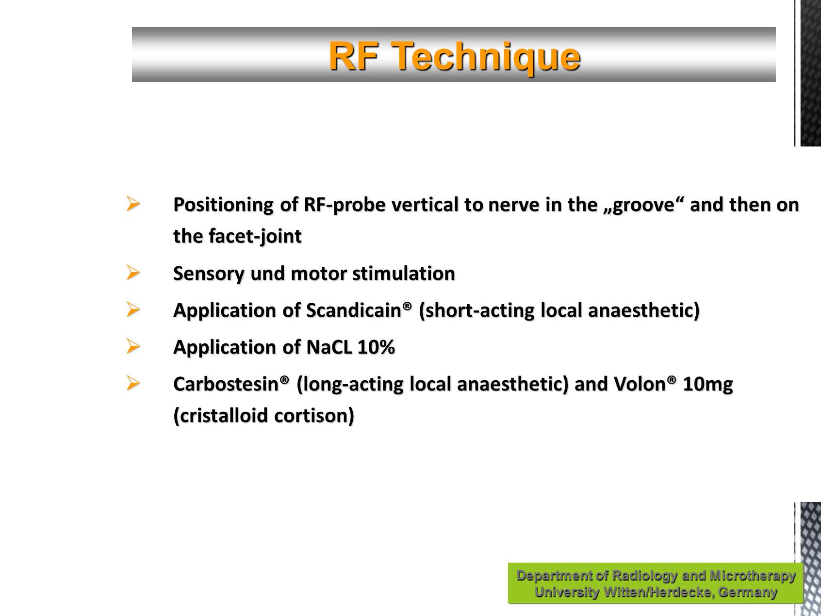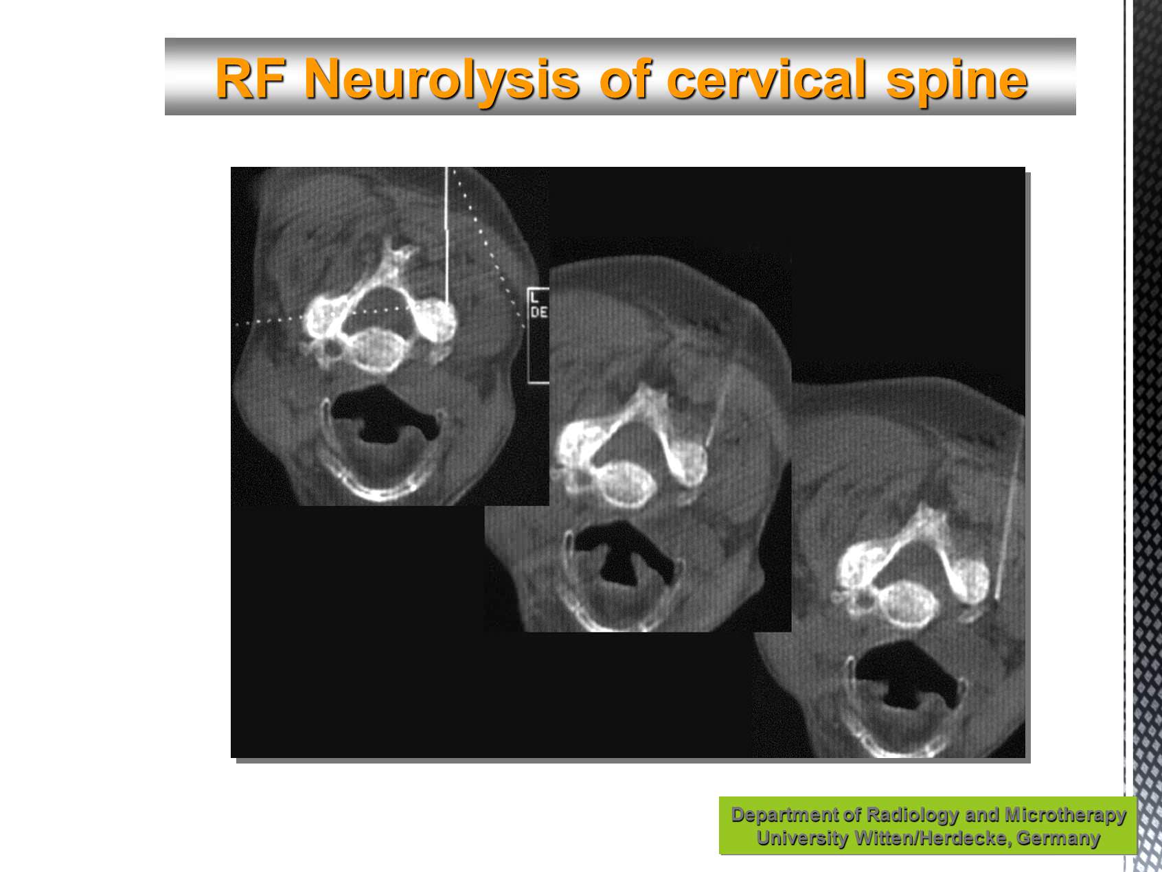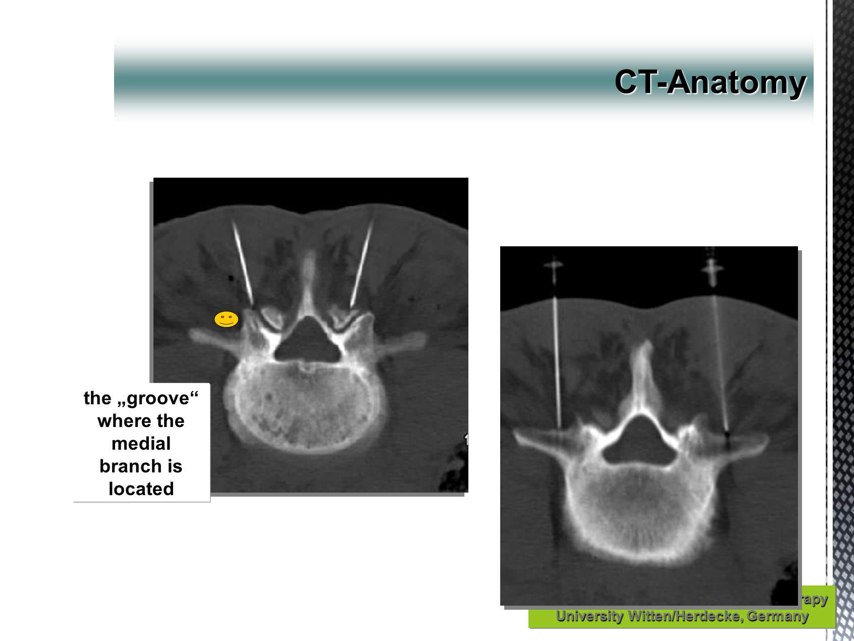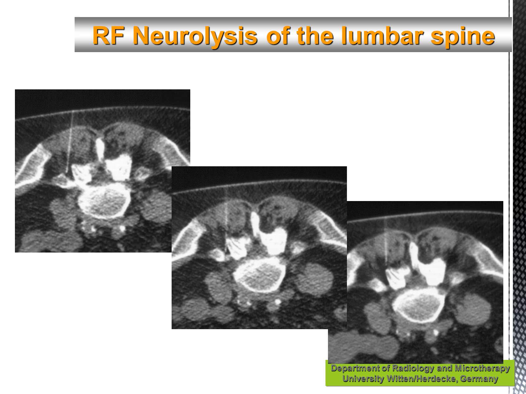 Un repérage scanner permet de localiser la zone de passage des rameaux nerveux postéro-médian.A l’aide d’une aiguille à ponction lombaire une stimulation des masses musculaires para-vertebrales permet de localiser la zone nerveuse à detruire.